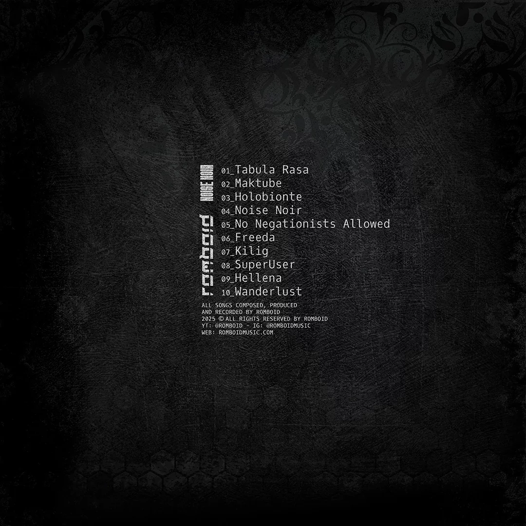 NOISE NOIR es el título del nuevo disco de Romboid, el cual es la finalización de una Tetralogía, tras los tres álbumes anteriores (publicados igualmente con el sello PVC), porque surge de las mismas sesiones de grabación, mismo concepto creativo e incluso mismo Hardware. Los 4 volúmenes en total son una selección de más de 100 tomas de grabación en directo.